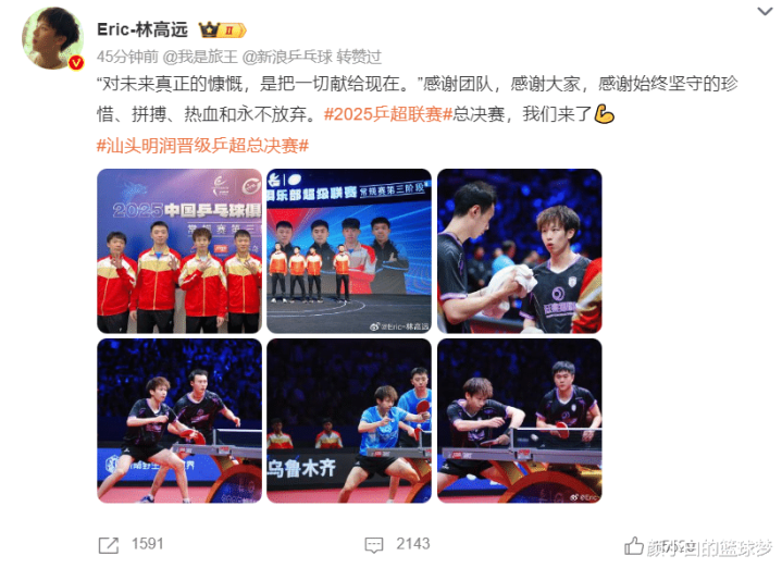 9月2日林高远在个东谈主社媒霸气发声:对异日真的的高亢,是把一切献给当今。感谢团队,感谢群众,感谢永恒信守的珍摄、拼搏、热血和永不消释。2025乒超联赛总决赛,咱们来了。