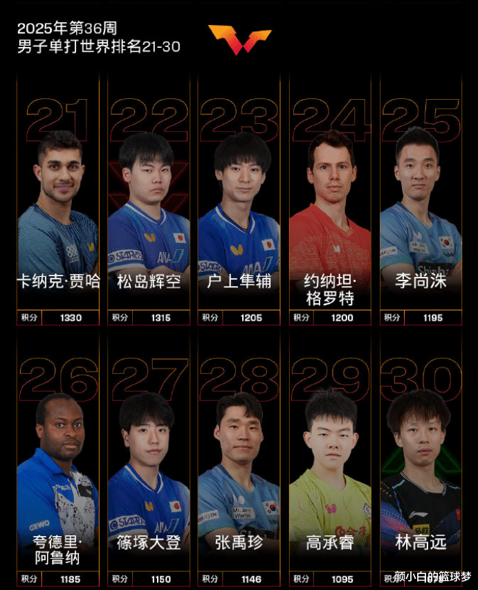 北京时辰9月2日,WTT官方公布了2025年第36周的寰宇男单名次情况,林诗栋第一,王楚钦第二,而30岁的宿将林高远依然下滑到第30位,就连高承睿、张禹珍、阿鲁纳等东谈主齐在林高远之前。