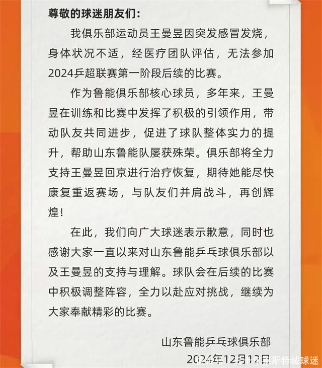 双十二晚间,山东鲁能乒乓球俱乐部发布公告称,王曼昱因突发伤风发热,身体状态不适,经医疗团队评估,无法参加2024乒超联赛第一阶段的后续比赛。