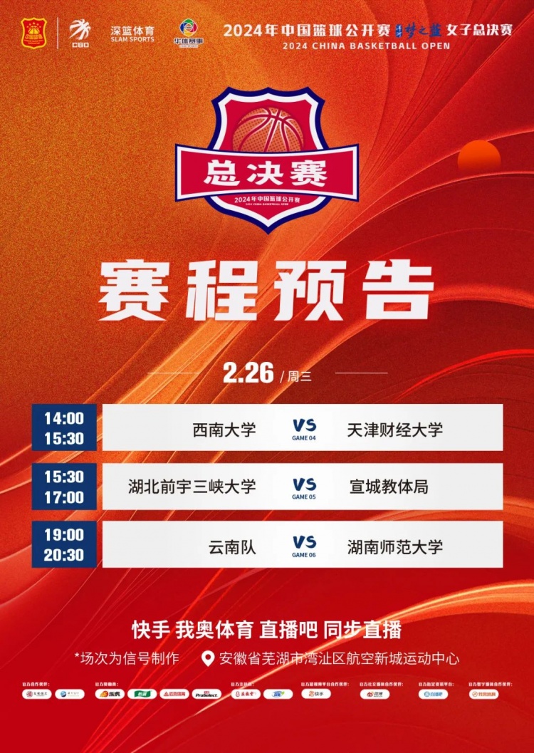 2月25日体育集锦,2024年中国篮球公开赛洋河梦之蓝女子总决赛在安徽省芜湖市湾沚区航空新城畅通中心打响。在首轮进行的三场比赛中,云南队、西南大学、湖南师范大学获得开门红。